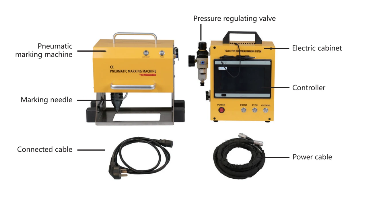 Dot Peen Marking Machine is mainly used for marking metals and non-metals(relatively hard hardness), such as various chassis number (VIN) number, engine numbers, mechanical parts, machine tools, hardware products, metal pipes, gears, pump bodies, valves, fasteners, steel, instruments and meters, electromechanical equipment, etc.